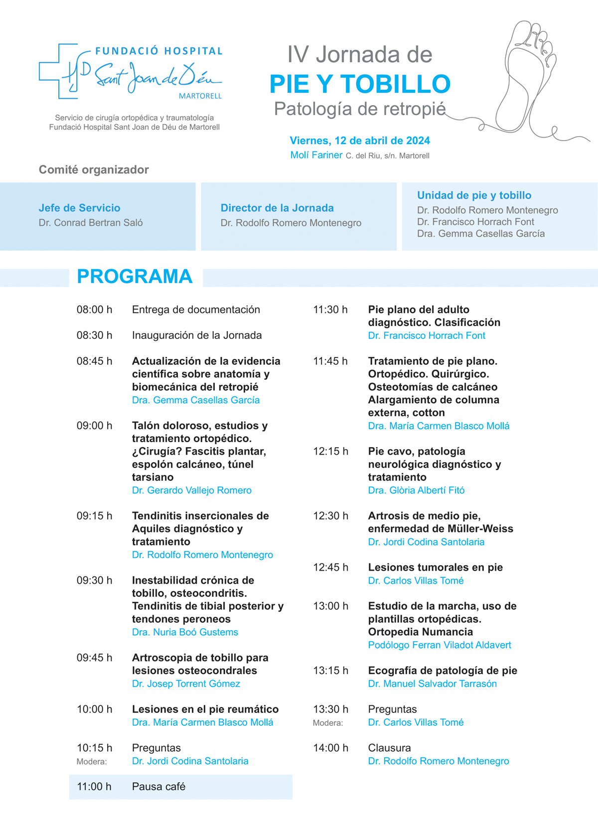 El proper divendres 12 d’abril, se celebrarà la IV Jornada de pie y tobillo. Patología del retropié, organitzada per la Fundació Hospital Sant Joan de Déu de Martorell (FHSJDM) i avalada per la Sociedad Española de Medicina y Cirugía de pie y tobillo (SEMCPT) i la Societat Catalana de Cirurgia Ortopèdica i Traumatologia (SCCOT). La jornada tindrà lloc de 08:00 a 14:30 hores al Molí Empresa de Martorell (Centre de Promoció Econòmica Molí Fariner).